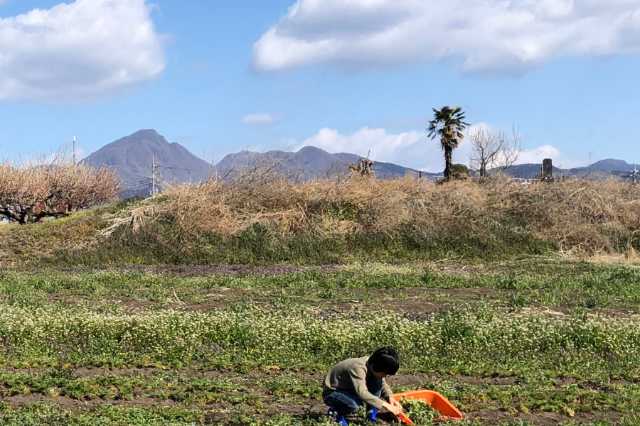 目の前の農園で、ただ無心に草をむしる。指先の感覚に集中し、土の香りに包まれる。